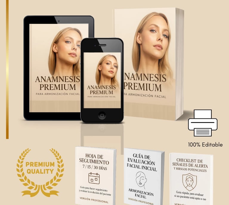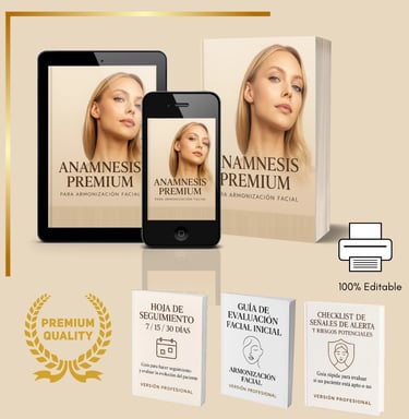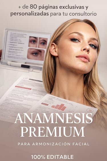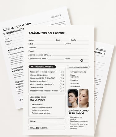 Anamnesis Premium es un paquete completo de documentación clínica diseñado para esteticistas y profesionales de armonización facial. Incluye más de 80 páginas exclusivas: fichas de anamnesis, procedimientos, consentimientos informados, hojas de atención y recomendaciones pos-tratamiento, todo totalmente editable en Canva.